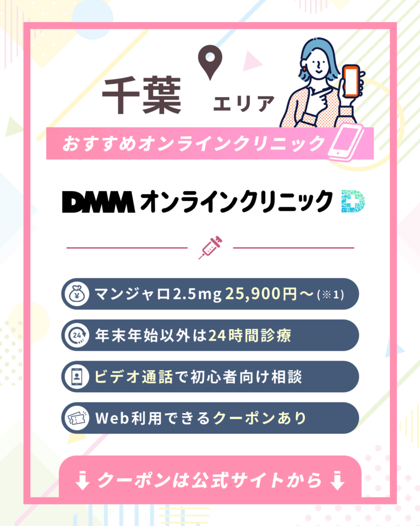 2025年10月時点で、クーポンコードを発行している千葉対象はDMMオンラインクリニックの5,000円割引がおすすめになるため、安い値段で処方してもらいたい人は参考にしてください。