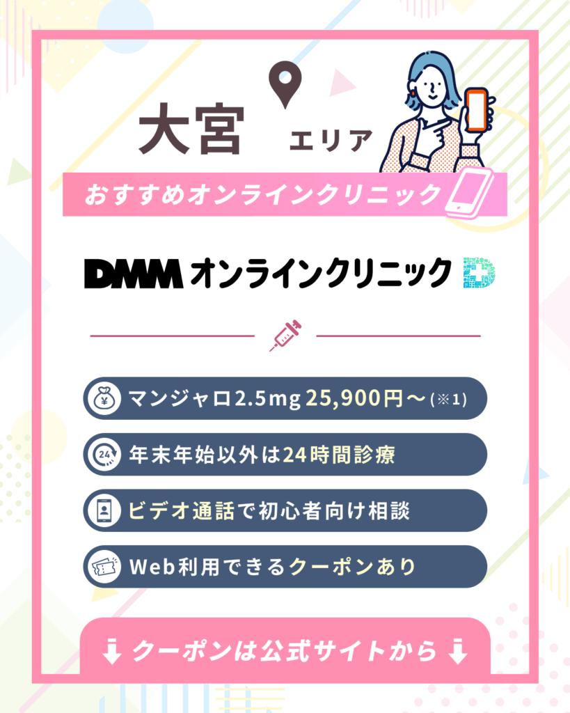 大宮対象のオンラインクリニック | 限られた時間で値段が安いマンジャロを処方してもらいたい →大宮対象でおすすめはDMMオンラインクリニック |